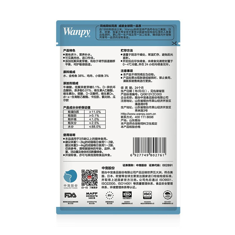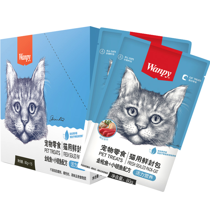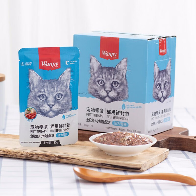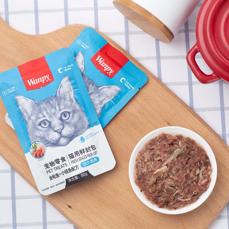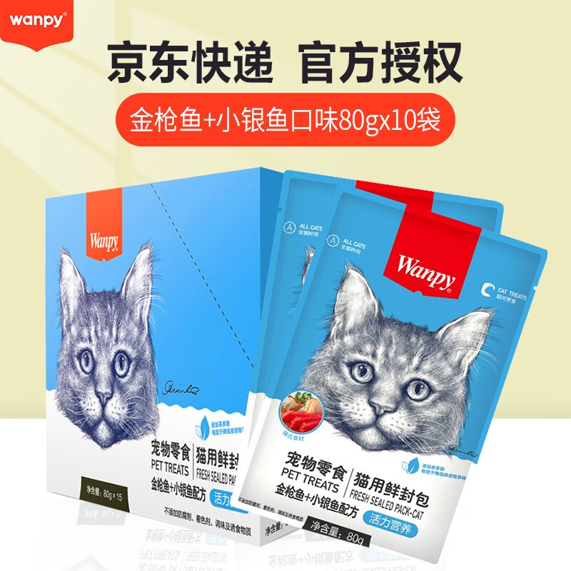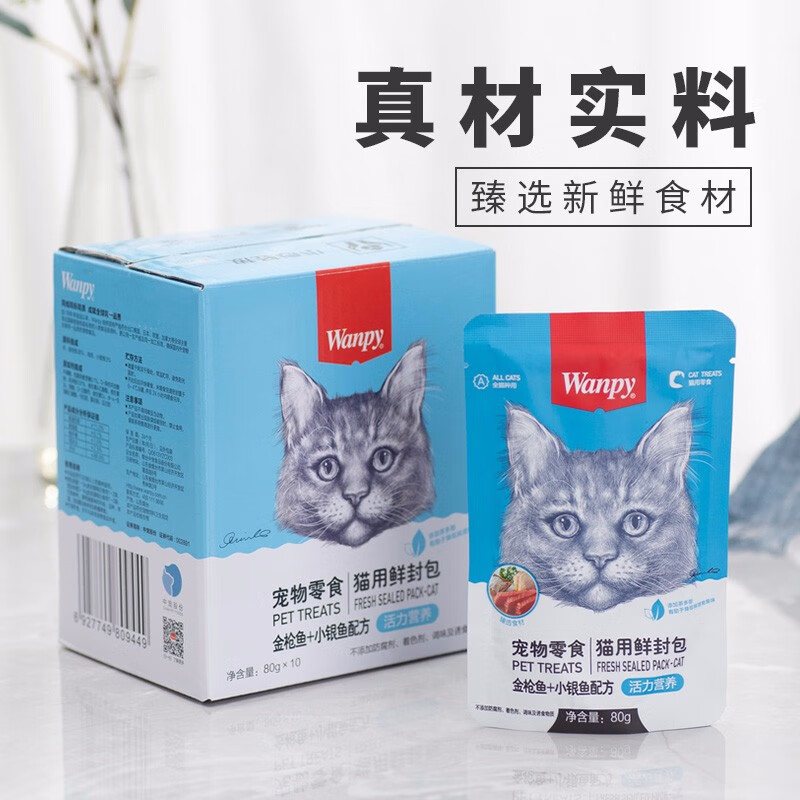 顽皮(Wanpy)猫咪鲜封包 宠物猫粮肉粒包 猫湿粮猫罐头整盒装 金枪鱼 小银鱼 80g*10袋