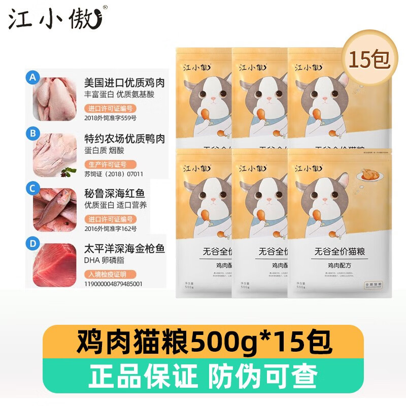 江小傲无谷鲜肉全价猫粮 成猫幼猫奶糕试吃鸡肉鸭肉牛肉发腮猫干粮低敏 鸡肉配方500g*15袋