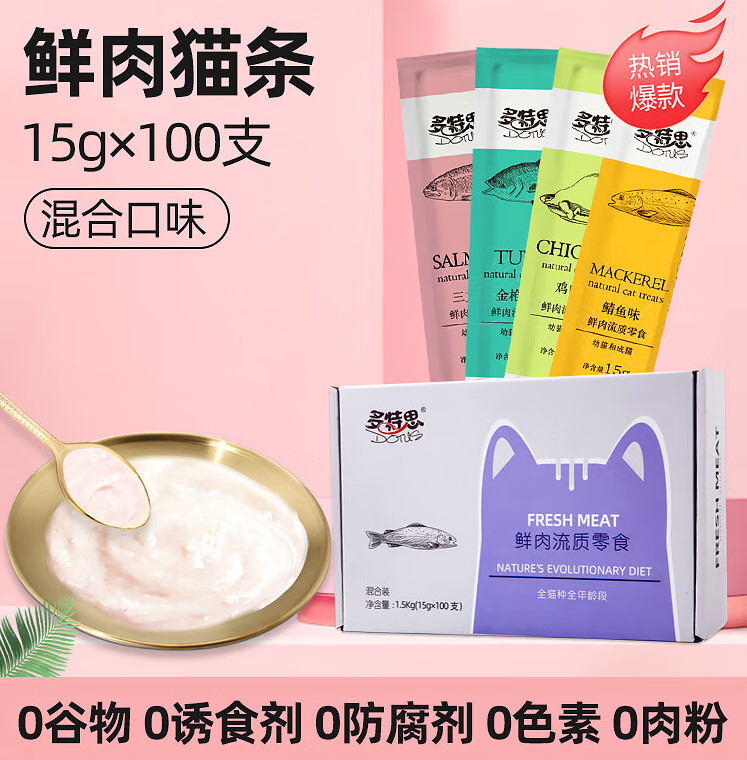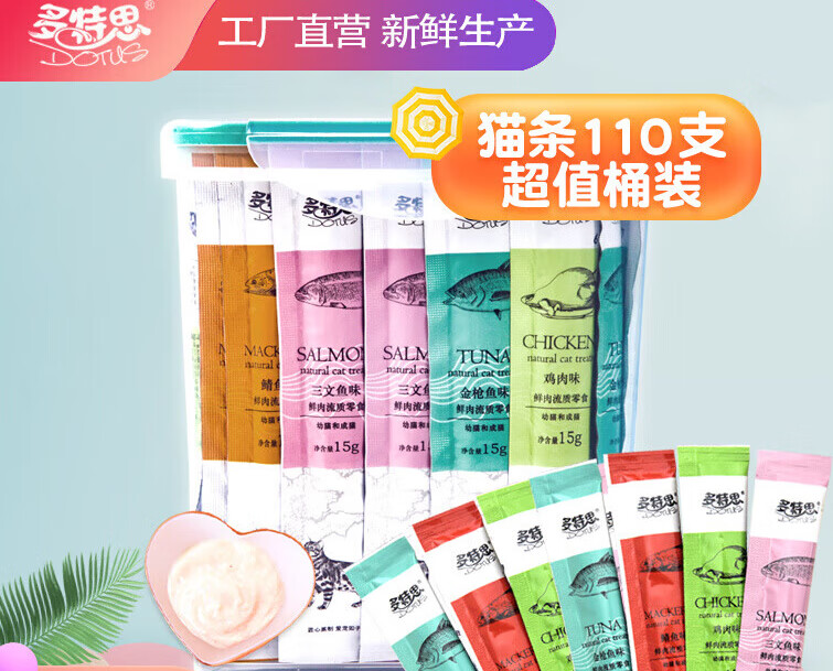 多特思(DOTUS)多特思猫咪零食猫条猫零食增肥补水幼猫成猫猫罐头猫条100支整箱 [够吃1个月]四种口味混合100 15g_单支重量