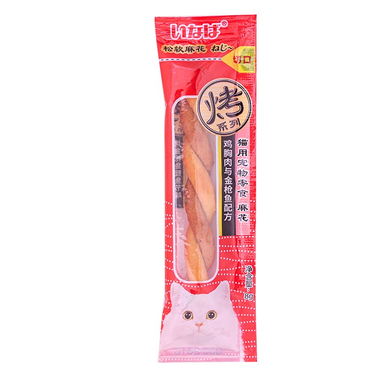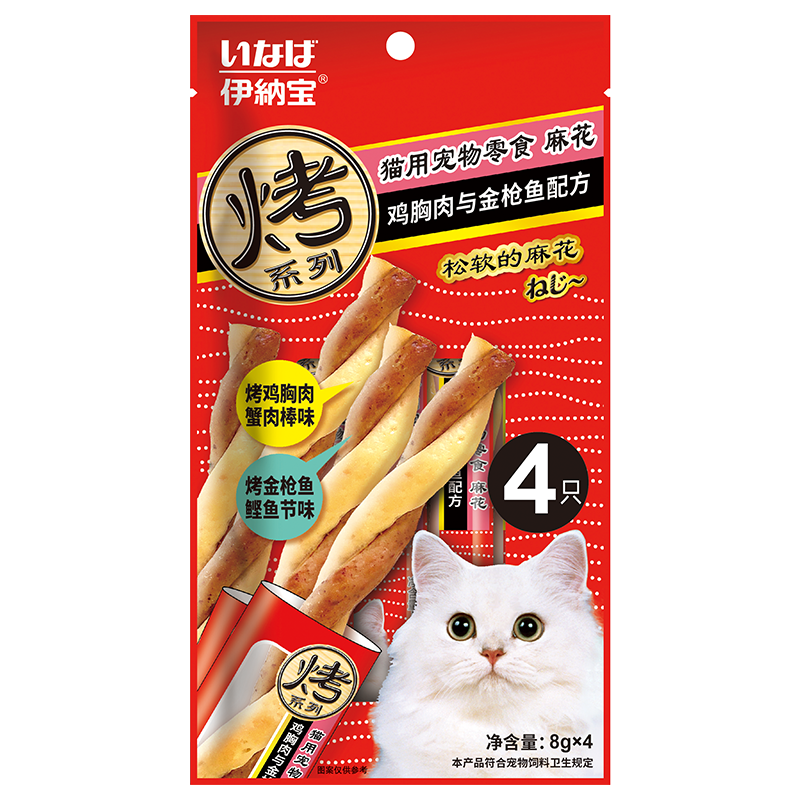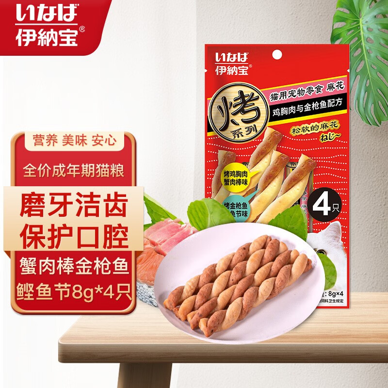 伊纳宝猫零食麻花 宠物猫洁齿磨牙鸡肉海鲜双拼猫条4条装 蟹肉棒金枪鱼鲣鱼节8g*4只