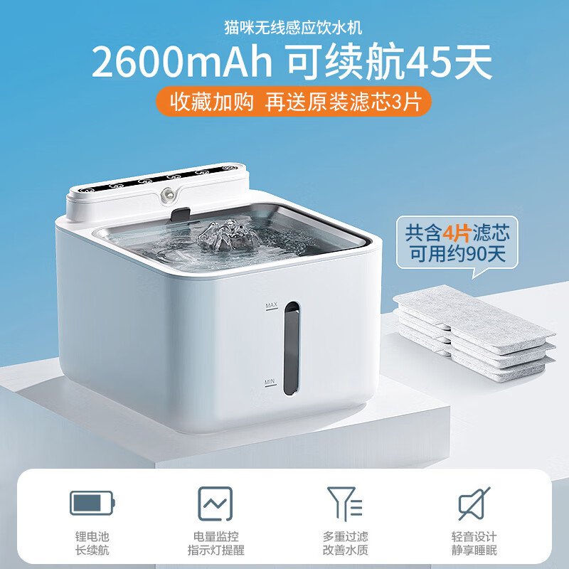 佩觉无线猫咪自动饮水机不插电宠物饮水器循环猫喝水器流动感应不湿嘴 2600毫安续航45天【赠3片滤芯共4