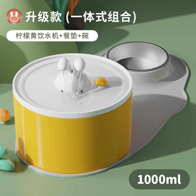 猫咪陶瓷饮水机自动循环流动喝水不湿嘴宠物饮水器狗狗水盆猫用品 兔子款-柠檬黄饮水机1L 餐垫 碗