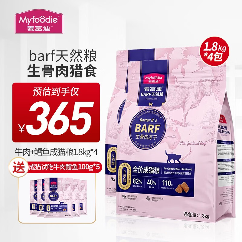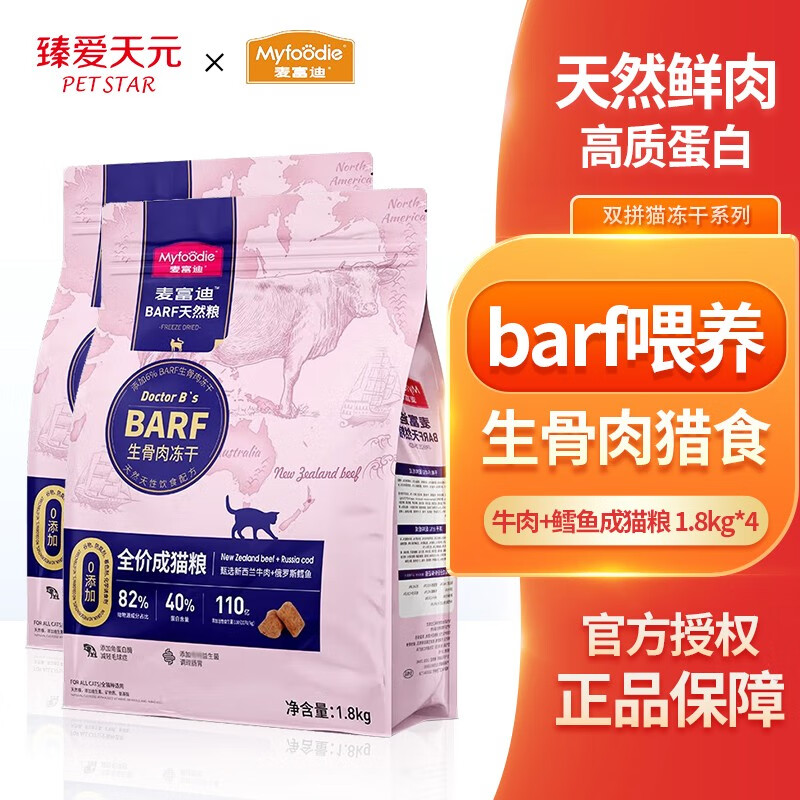 麦富迪(Myfoodie)猫粮barf生骨肉主食冻干双拼天然粮鲜肉营养无谷高肉高蛋白 牛肉 鳕鱼成猫粮 1.8kg*4