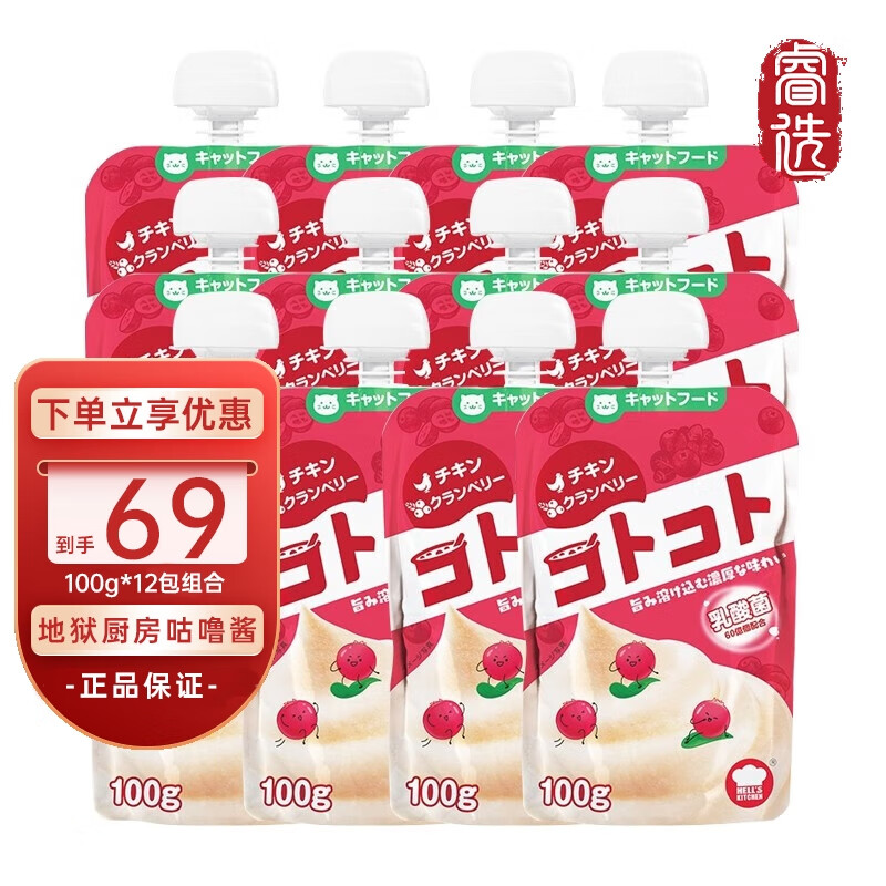 地狱厨房(Hell's Kitchen)经典咕噜酱猫咪零食成猫湿粮包猫条牛肉松茸肉泥猫零食 鸡肉蔓越莓 100g*12包