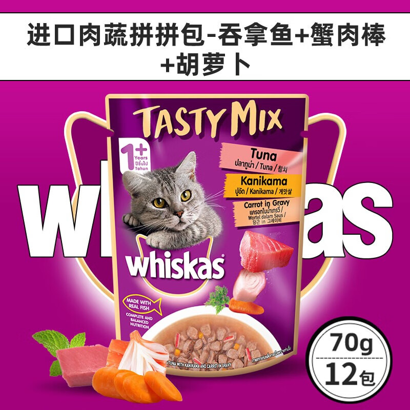 伟嘉(whiskas)妙鲜包12包整盒猫罐头猫咪零食成猫专用猫零食多口味 进口-吞拿鱼蟹柳胡萝卜70g*12包