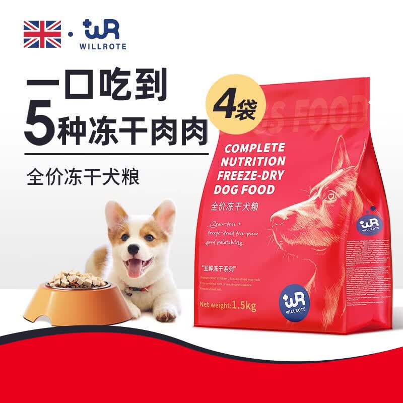 威洛特普安特无谷狗粮全价五拼鲜肉冻干狗粮通用型小型犬幼犬成犬专用犬粮美毛 5五拼鲜肉全价冻干犬粮1.5kg*4袋(12斤)