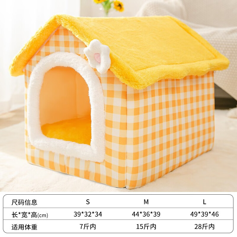 嬉皮狗猫窝四季通用房子型冬天保暖宠物猫咪床冬季可拆洗幼猫封闭式狗屋 黄色小花 大号:49*39*46cm(适合28斤内宠物)