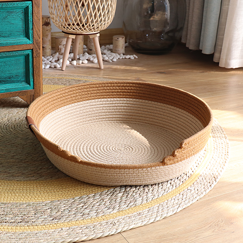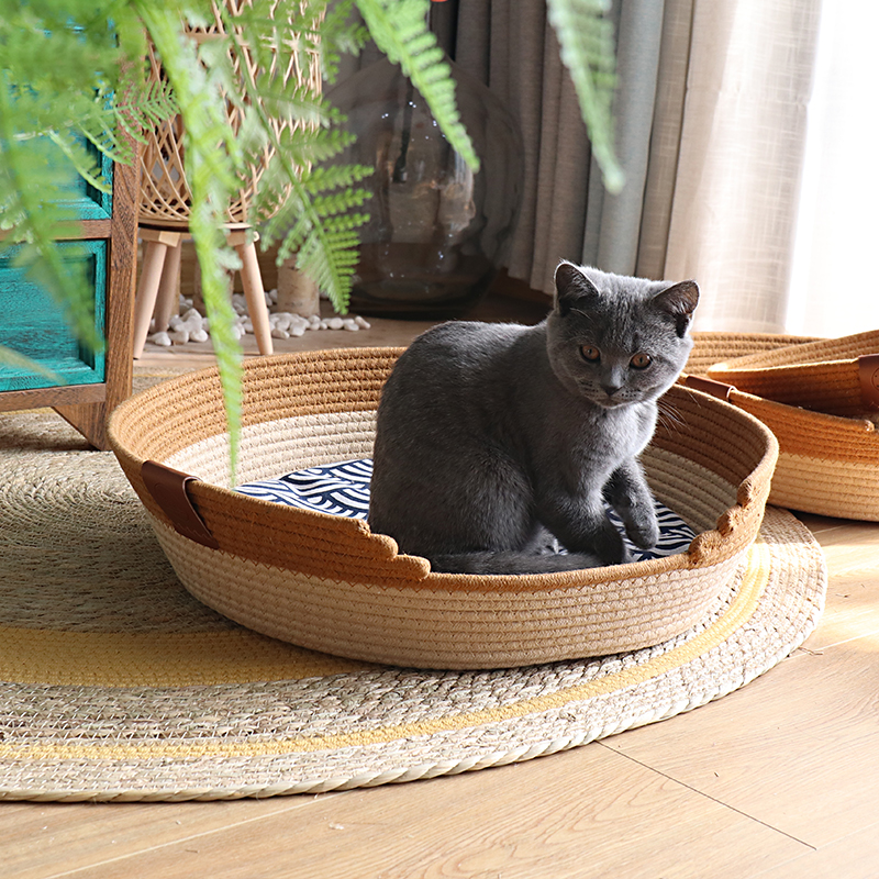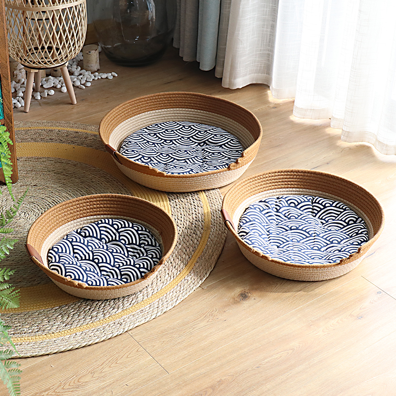瑾伦*夏季藤编猫窝四季通用日式网红编织棉垫保暖宠物睡觉狗窝床猫爪板 棕色款 棉垫 凉席 冰垫 XL号直径55厘米(适合28斤内的)