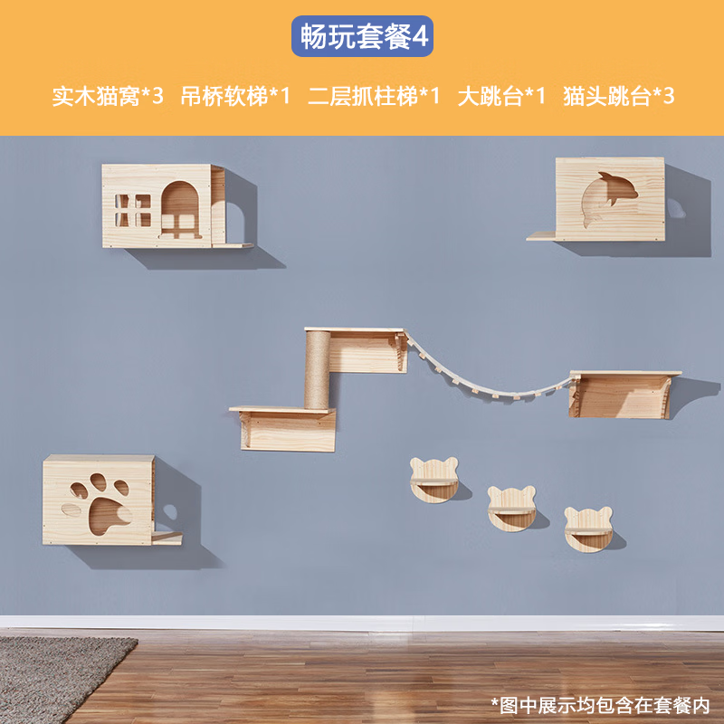【实木小户型】猫爬架壁挂式实木猫窝树猫墙壁式跳台抓柱板木质墙上猫架 【小户型畅玩款】套4 【送货到家 自己装】