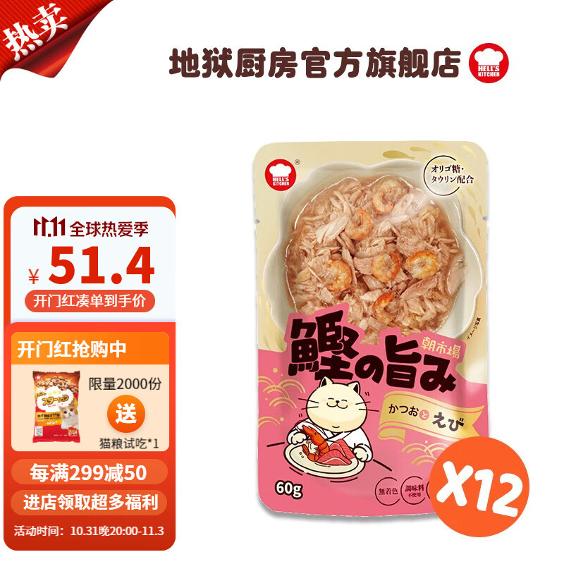 【双十一现货抢购】日本地狱厨房Hell's Kitchen进口朝市场餐包湿粮肉粒妙鲜包猫罐头成猫幼猫 鲣鱼虾*12包