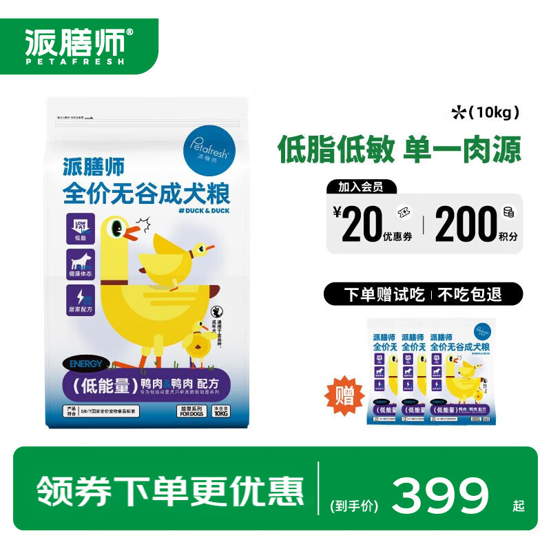 派膳师(PETAFRESH)低能量系列 犬粮全价无谷狗粮 控制体重低脂 适用遛狗时间1小时内 鸭肉配方10kg(带3包试吃)