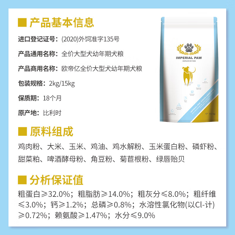 欧帝亿(IMPERIAL PAW)大型犬幼犬狗粮 全价幼年期犬粮 2kg 金毛拉布拉多德牧马犬萨摩耶