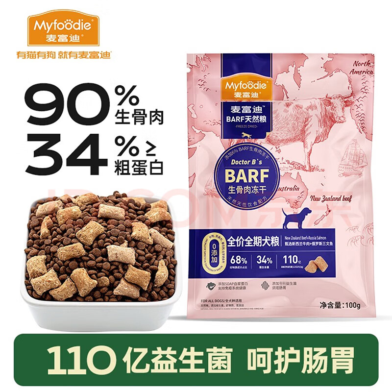 麦富迪狗粮 barf生骨肉主食冻干双拼天然粮成犬幼犬全犬种通用全价犬粮 牛肉 三文鱼试吃100g