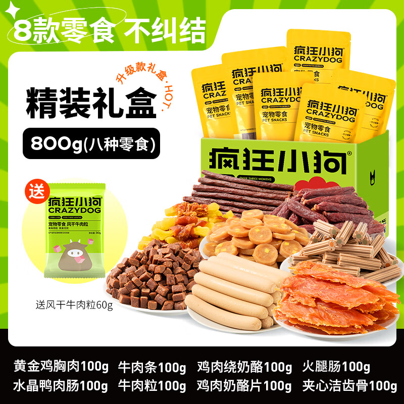 栗好嘉疯狂小狗狗零食鸭肉干宠物泰迪柯基幼犬大小型犬耐咬磨牙棒 精装礼盒800g送风干牛肉粒60g 1盒