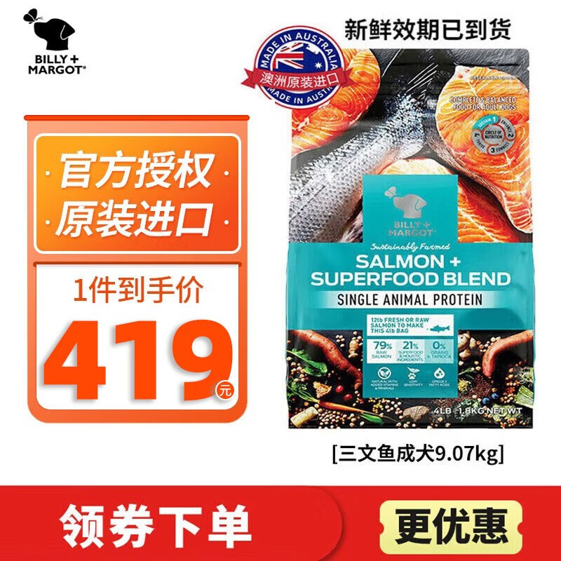 比利玛格(BILLY MARGOT)宠物狗粮澳洲进口全价犬粮无谷低敏通用金毛泰迪狗狗主粮 三文鱼9.07kg