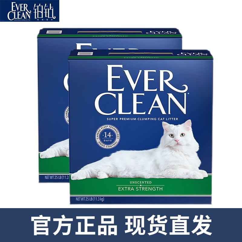 【授权正品】美国进口铂钻猫砂25磅蓝标 EverClean活性炭除臭膨润土矿石无尘25磅11.3kg 绿标-50磅-发2箱