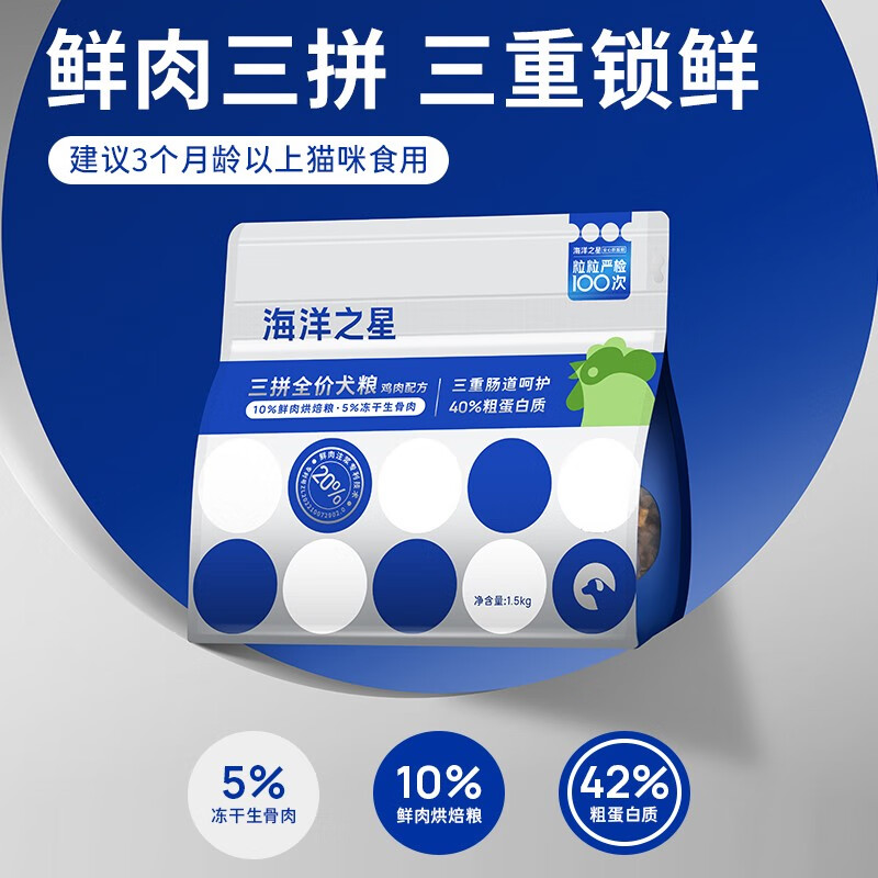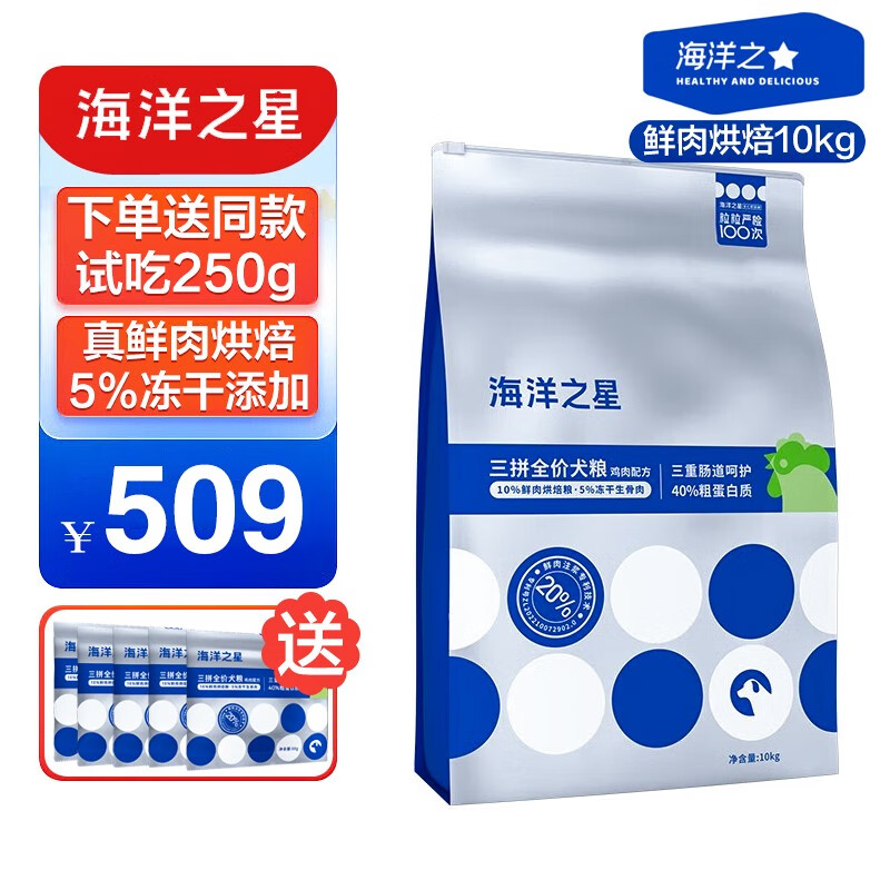 海洋之星全价鲜肉低温烘焙犬粮4.5kg幼犬成犬鸡肉鸭肉90%鲜肉狗粮