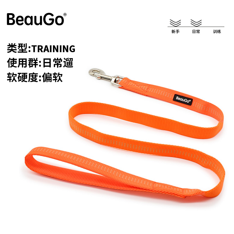 BeauGo贝宝捷软尼龙编织牵引绳训练训犬遛狗扁绳中大型犬宠物用品 橙色(宽15mm) 1.2米长度