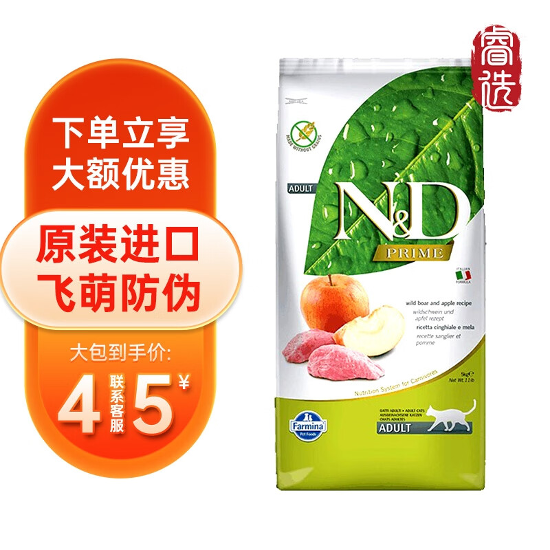 法米娜farmina石榴鸡鲱鱼甜橙ND无谷低敏美毛成猫幼猫粮 无谷猪肉苹果配方 成猫粮5kg 23.05