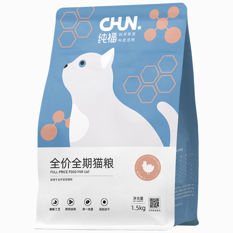 纯福(chunfu)酶解鸡肉猫粮幼猫成猫全阶段布偶天然全期无谷冻干 全期猫粮7.5kg【5包装】