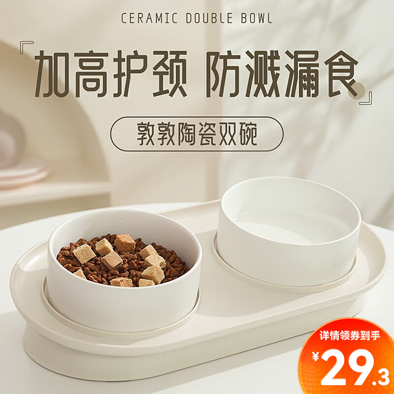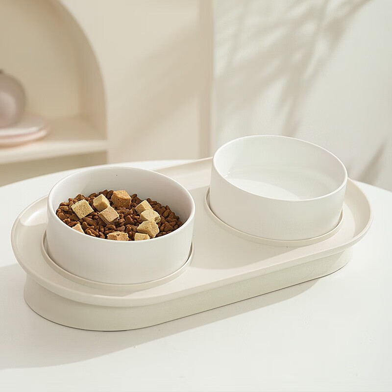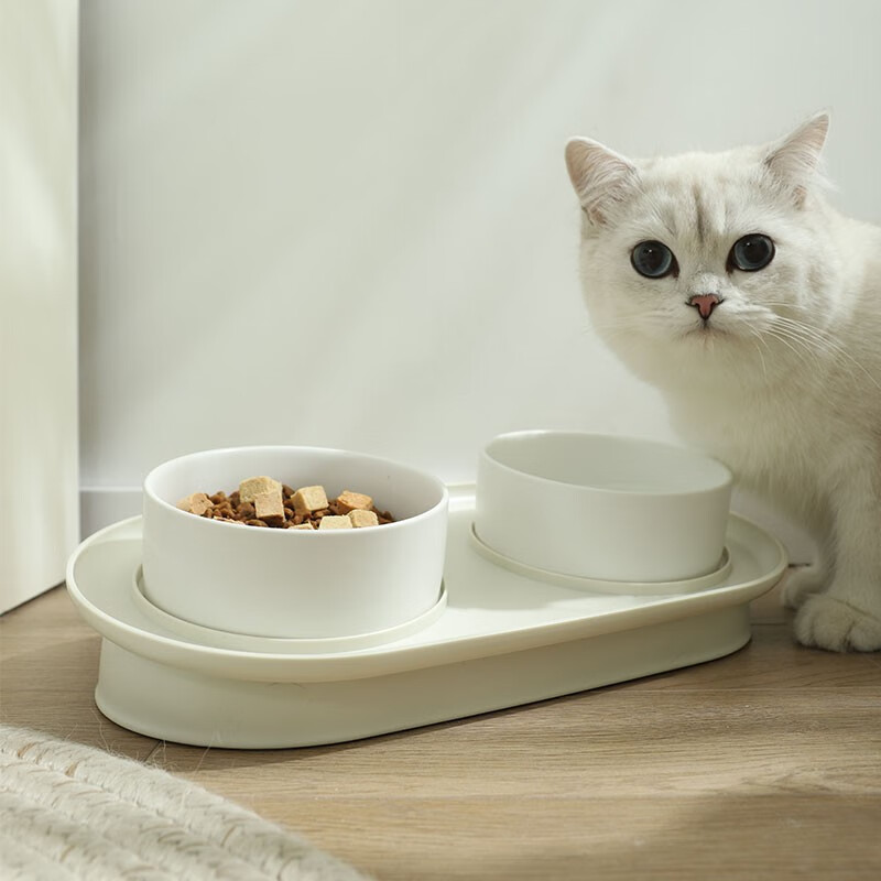 华元宠具(hoopet)猫碗陶瓷宠物碗猫盆双碗猫食盆狗盆防打翻喝水猫粮碗饭盆猫咪护颈 奶油白 【防漏食碗架 陶瓷双碗】