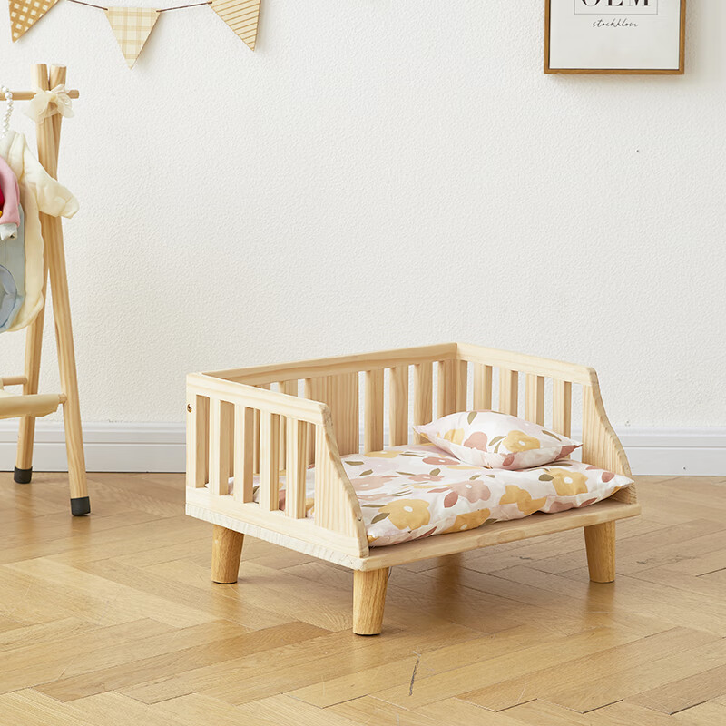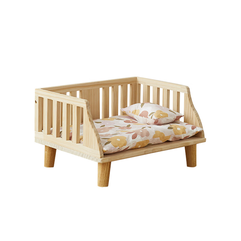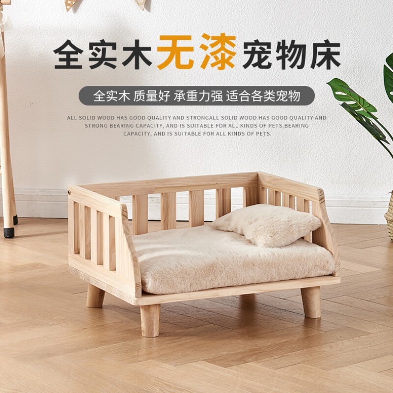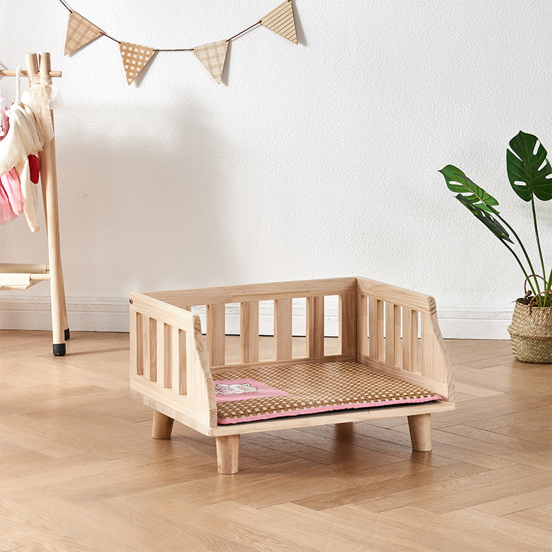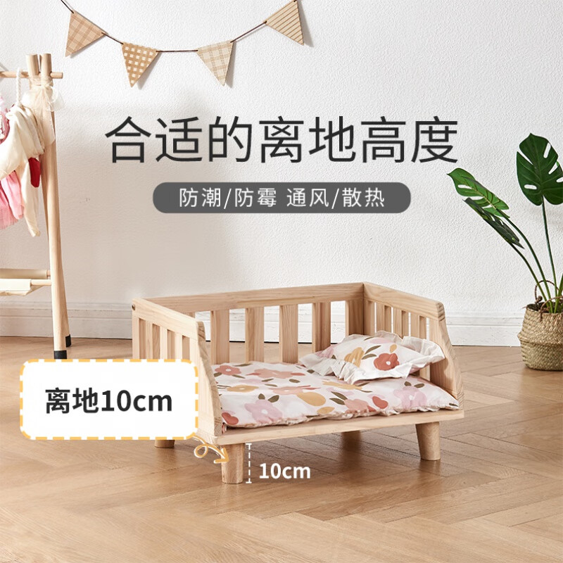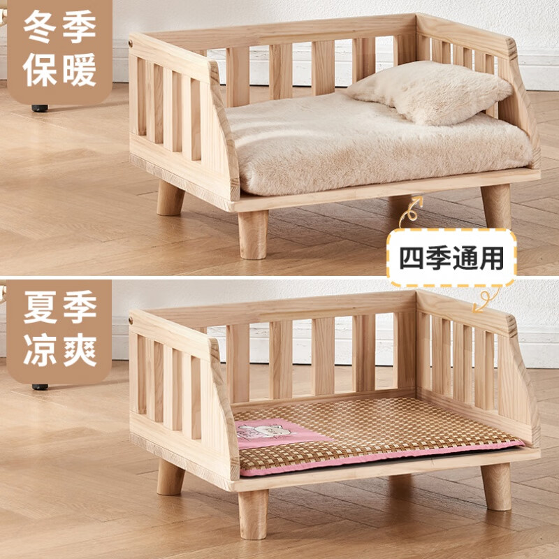 皆百福 猫窝四季通用实木狗狗床狗窝泰迪床小型犬中型犬猫床四季通用可拆洗离地宠物床 围栏款【粉色凉席】 S-小型【适合10斤以内】