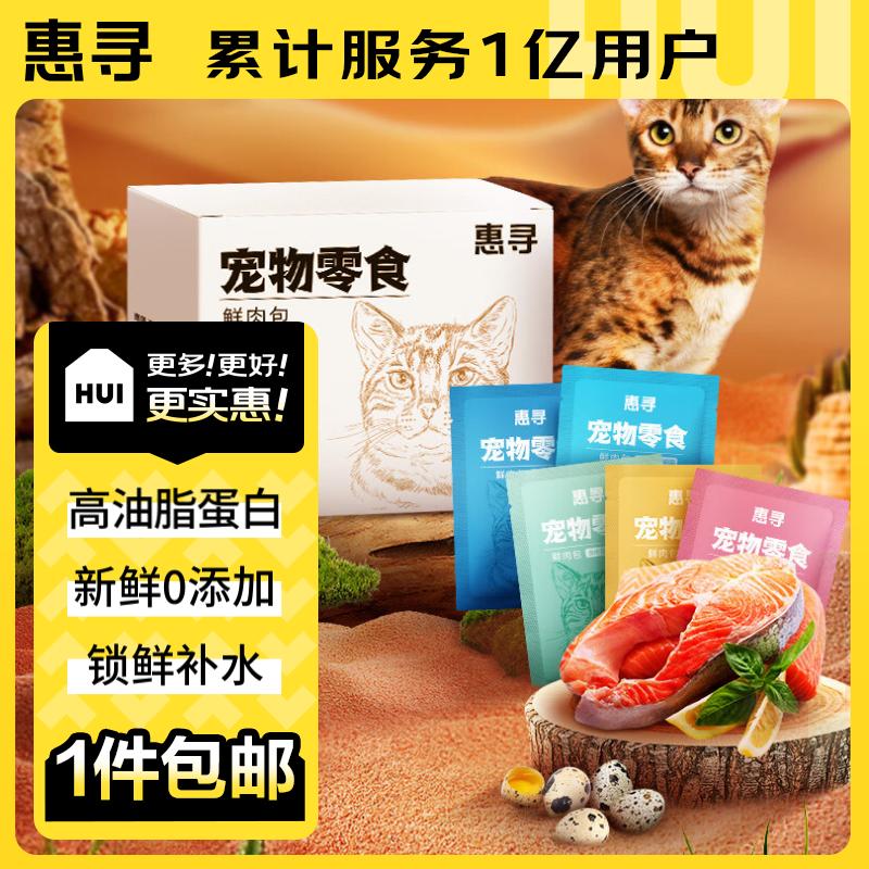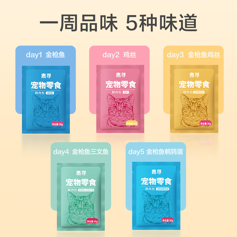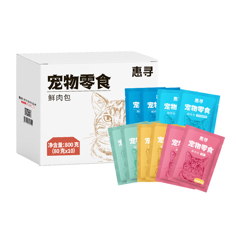 惠寻猫咪肉粒包宠物零食妙鲜包猫湿粮拌饭营养 5 种口味(80g*10 袋)