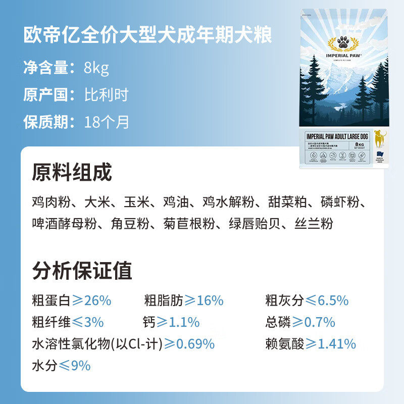 欧帝亿(IMPERIAL PAW)大型犬成犬狗粮 全价成年期犬粮 8kg 金毛拉布拉多德牧马犬萨摩耶