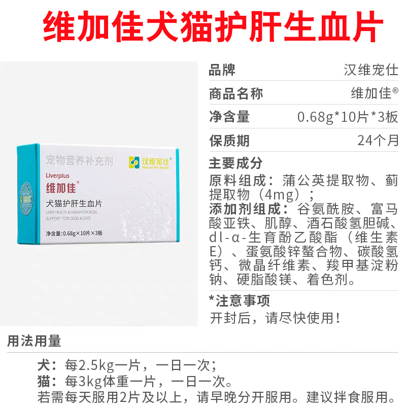 汉维宠仕维加佳宠物犬猫生血补铁保护肝脏护肝片加强肝脏免疫力猫传腹辅助治疗药物 维加佳