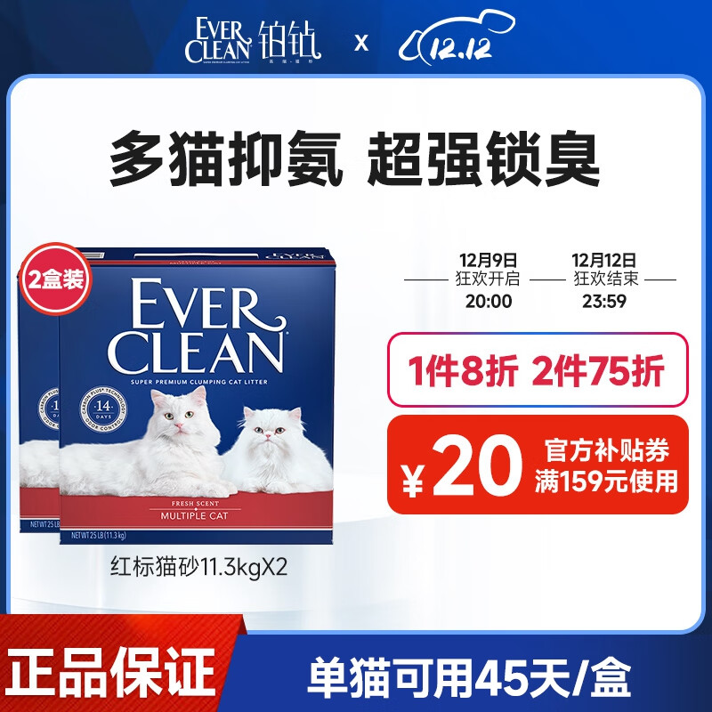 铂钻(EverClean)原装进口铂钻高效除臭抑菌活性炭膨润土猫砂25磅*2箱装 红标多猫抑氨猫砂11.3kg*2箱