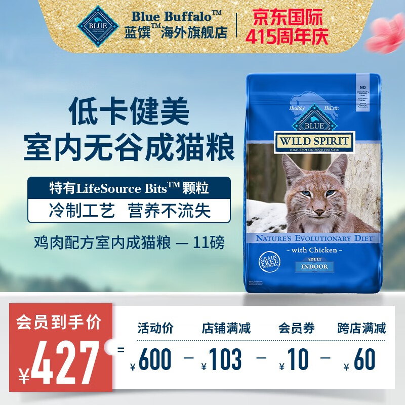 蓝馔(BLUE BUFFALO)美国蓝馔bluebuffalo原野精灵系列进口室内无谷鸡肉成猫猫粮11磅 室内无谷成猫粮11磅