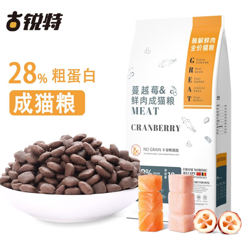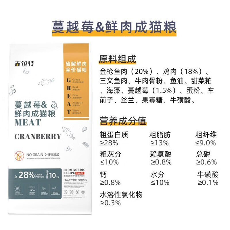 古锐特全价无谷鲜肉猫粮10kg幼猫成猫全阶段增肥美毛猫干粮 28蛋白-蔓越莓鲜肉(成猫粮) 10 kg