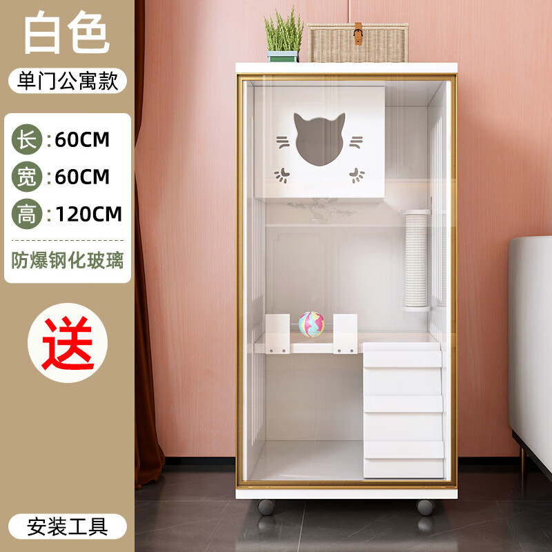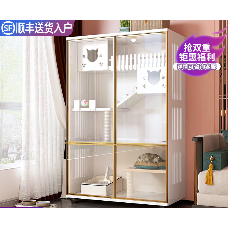 小米城堡木质猫笼 家用猫别墅室内猫舍多层猫柜超大自由空间猫房带厕所猫 轻奢白+透明玻璃长60*宽60*高120 自行安装