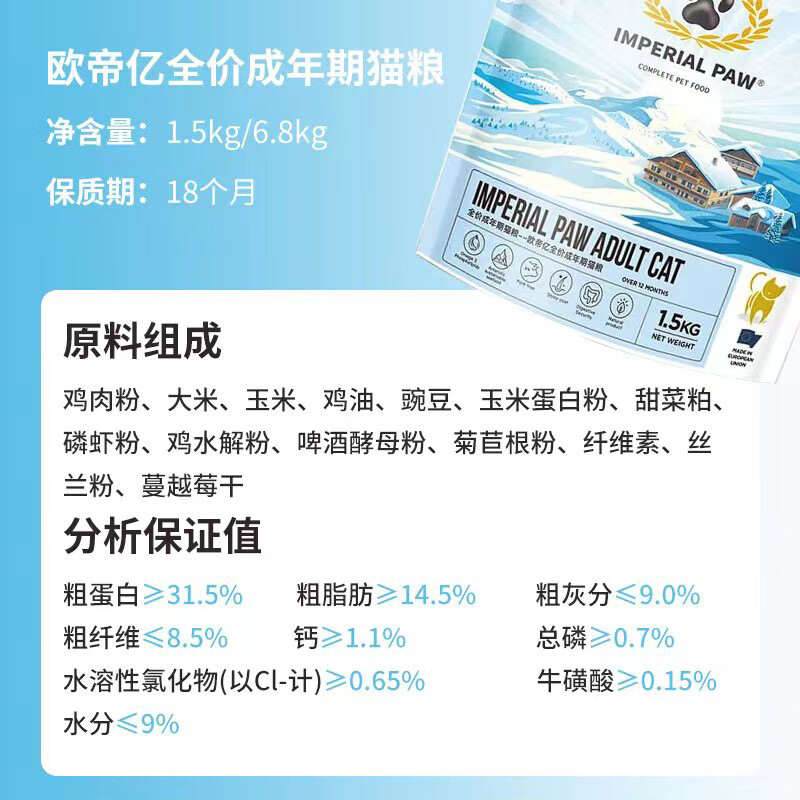 欧帝亿(IMPERIAL PAW)成猫猫粮天然粮 全价成年期猫粮 6.8kg 布偶橘猫美短英短增肥发腮