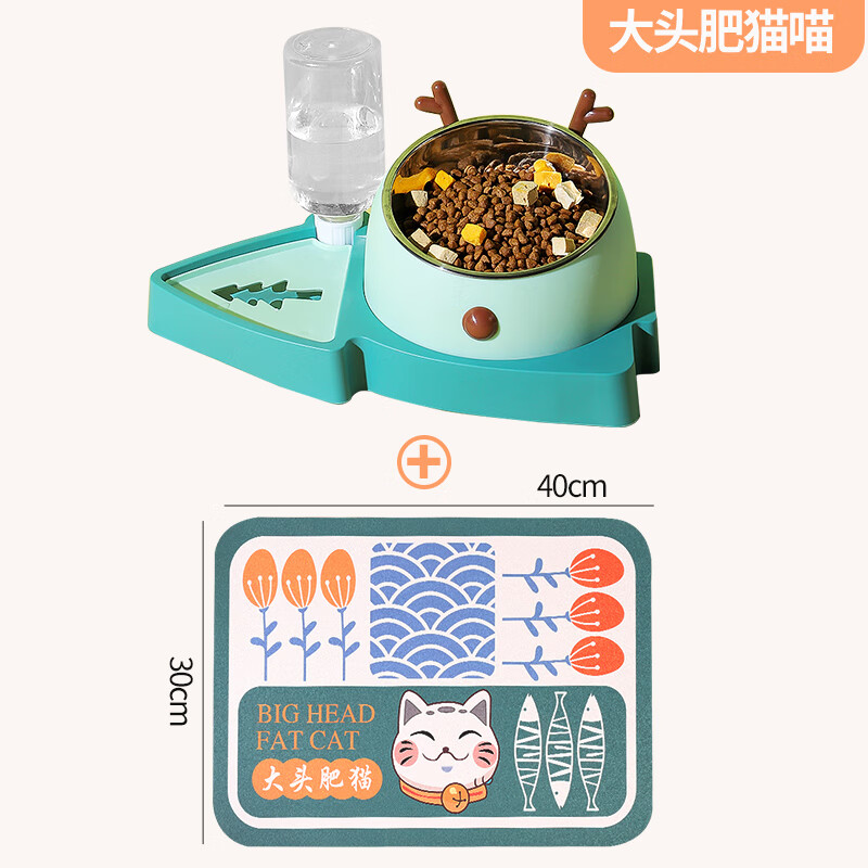 猫碗双碗自动饮水一体狗碗狗食盆护颈椎饭盆喝水狗狗猫咪宠物用品 【森林绿】可拆卸不锈钢碗 卡通餐垫【大头肥猫】 自动出水 550ml水瓶 2-3天不加水发货速度快