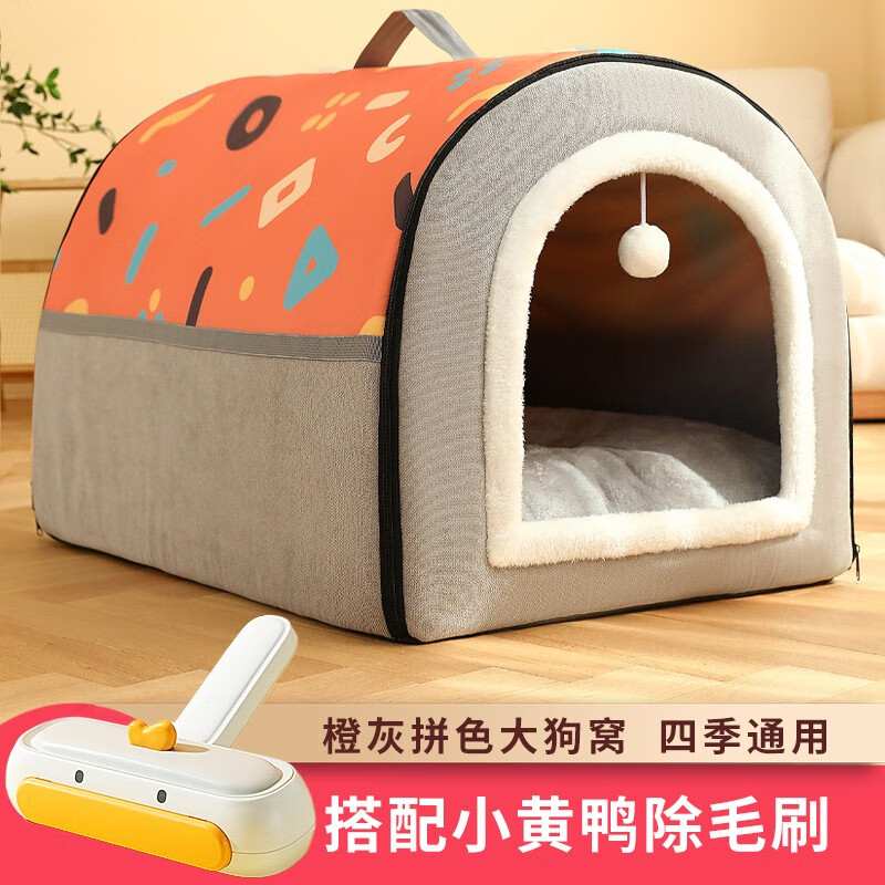 KimPets狗窝大型犬冬季保暖狗狗床可拆洗冬季猫窝封闭式狗屋冬天宠物用品 橙灰拼接色 小黄鸭除毛刷 M号【50*39*36cm适合15斤内】