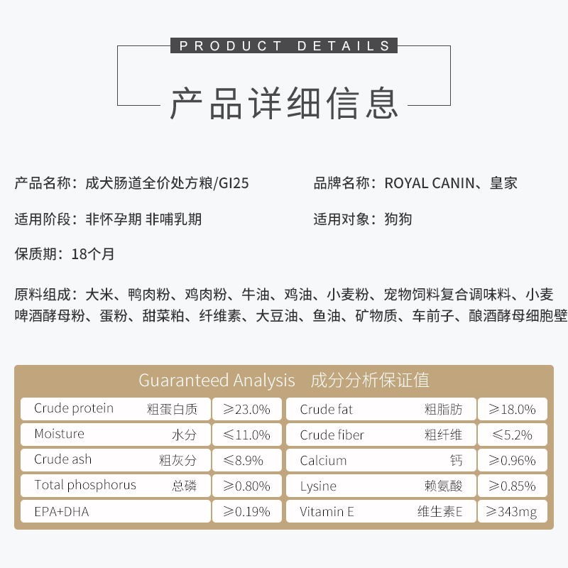 皇家狗粮 GI25成犬肠道处方粮GIJ29幼犬粮消化不良胃肠炎结肠炎厌食症急慢性腹泻狗粮 GI25成犬肠道全价处方粮7.5kg