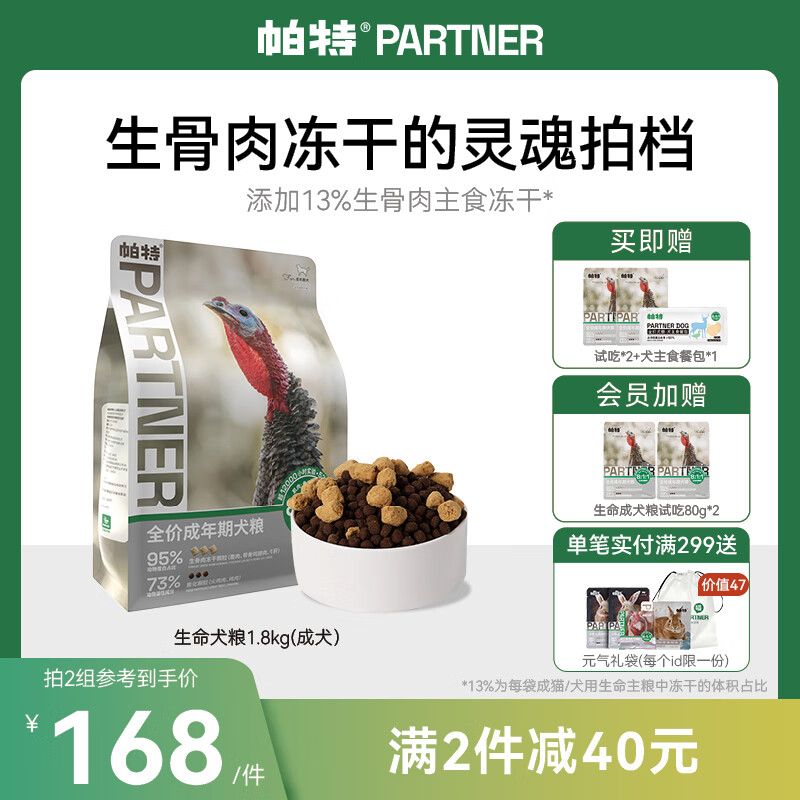 帕特【生命系列】生骨肉冻干无谷低敏鸡肉成犬幼犬通用宠物狗粮1.8kg 【成犬】-火鸡肉 生骨肉冻干 1.8kg/袋 生命犬粮-增肌健骨-1.8kg
