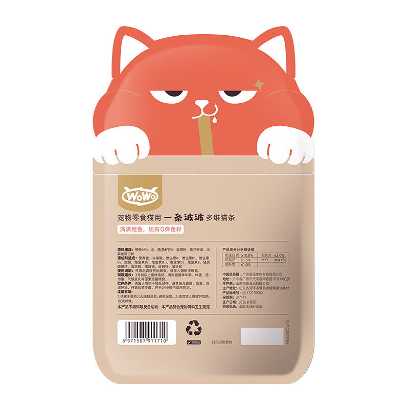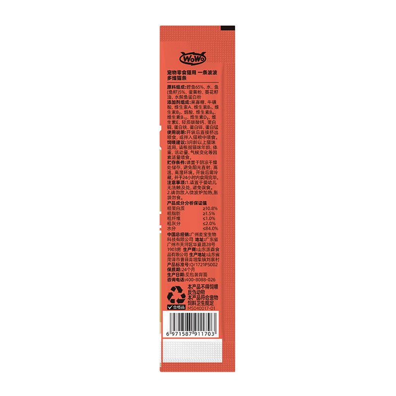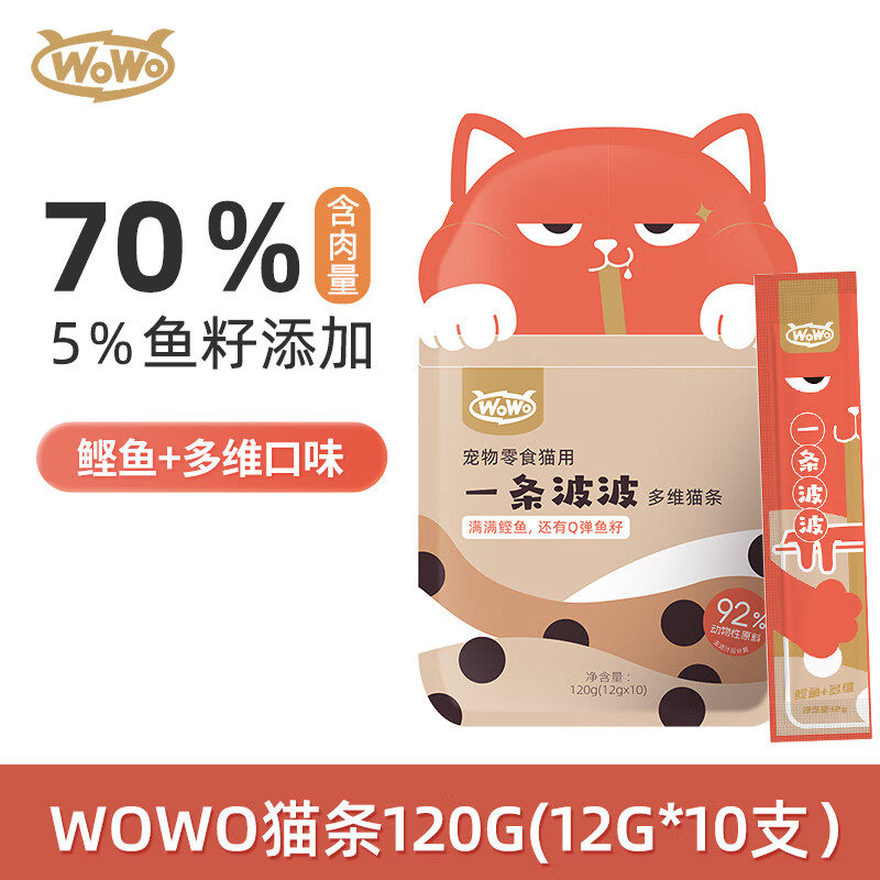 喔喔(WOWO)喔喔猫条 一条波波成猫幼猫猫零食猫湿粮 【升级】鲣鱼 多维味 12g*10支