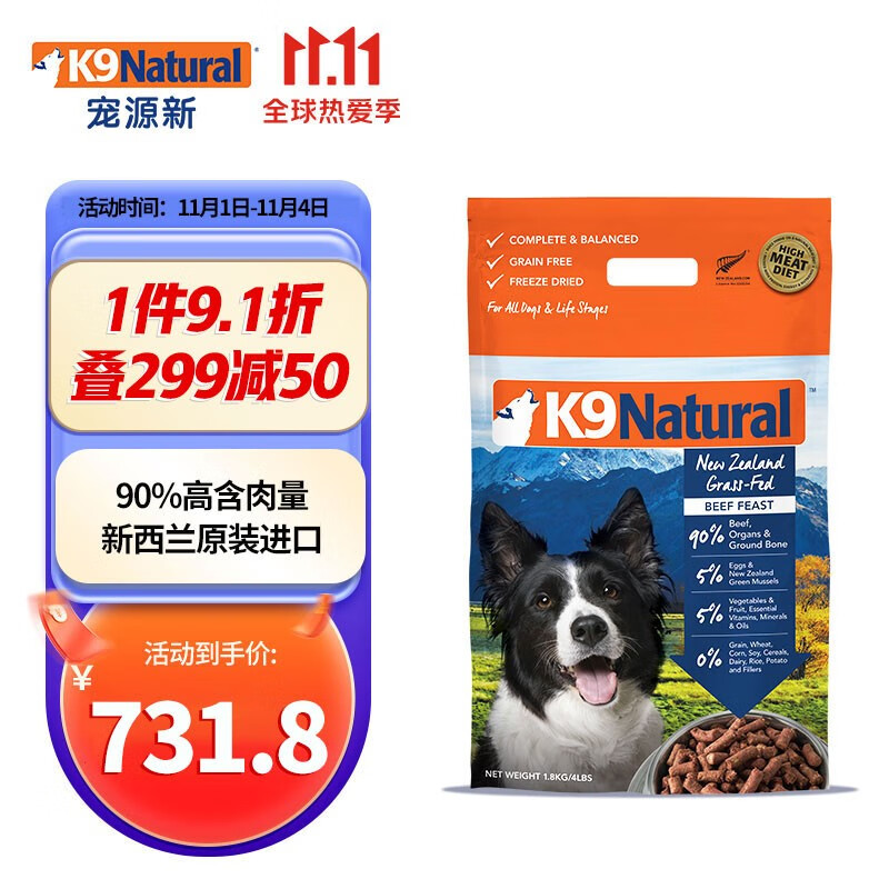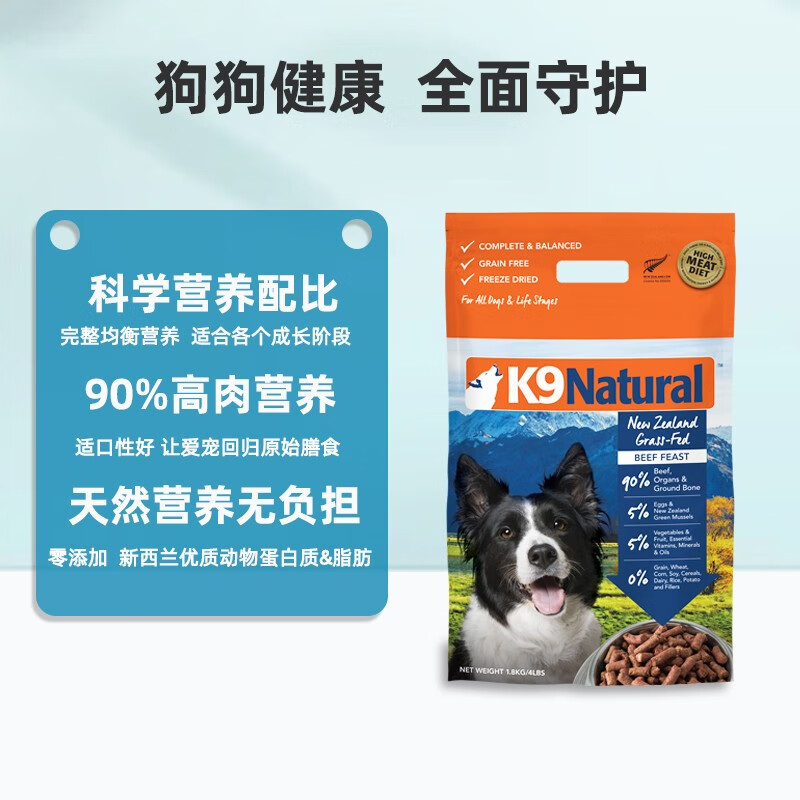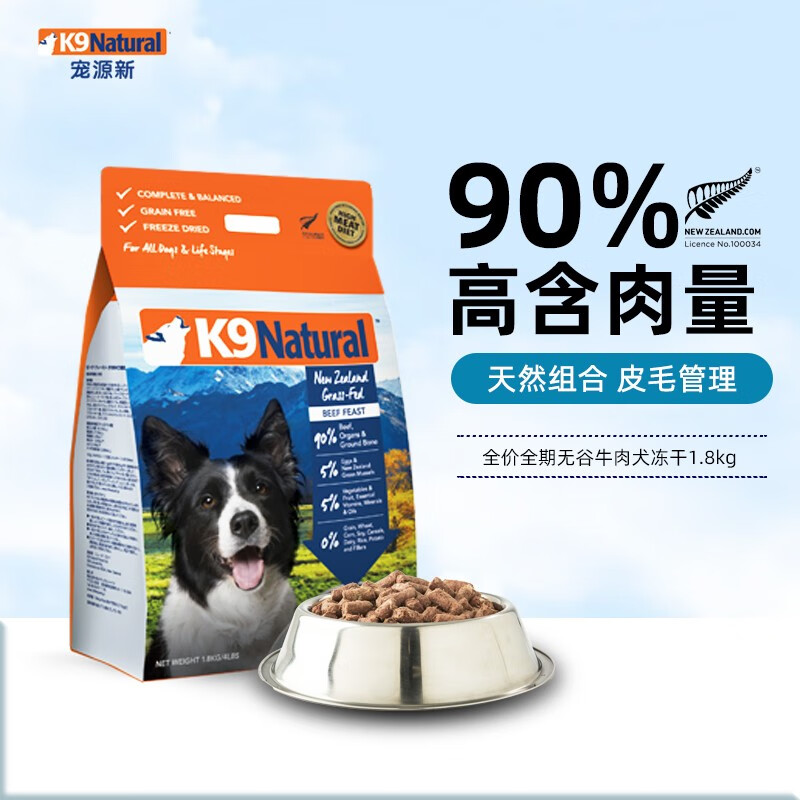 【顺丰发货】K9Natural 新西兰原装进口狗粮 成犬幼犬通用冻干犬主粮 牛肉味1.8kg