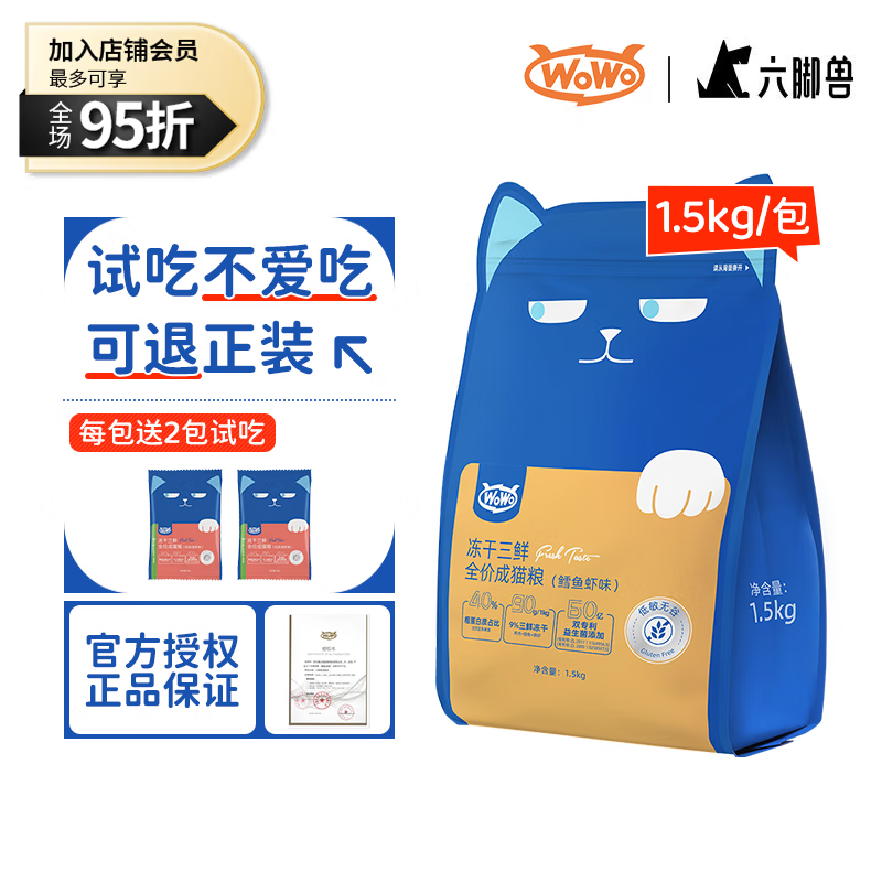 WOWO喔喔猫粮 冻干三鲜胃肠呵护全价成猫粮3种冻干4种肉专治挑嘴 鳕鱼味1.5kg赠试吃*2