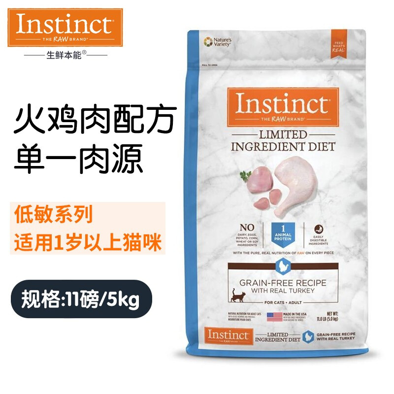 Instinct生鲜本能百利低敏进口猫粮单一火鸡肉配方减少过敏【适用于一岁以上的猫咪】11磅/5kg 低敏火鸡猫粮5kg