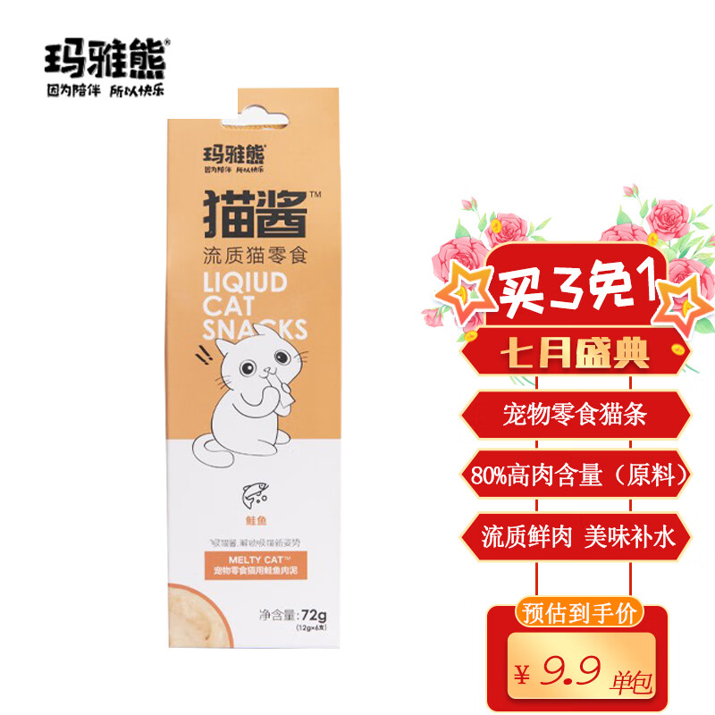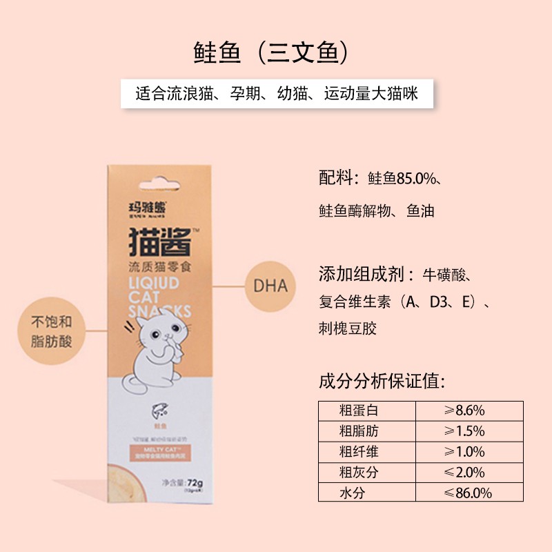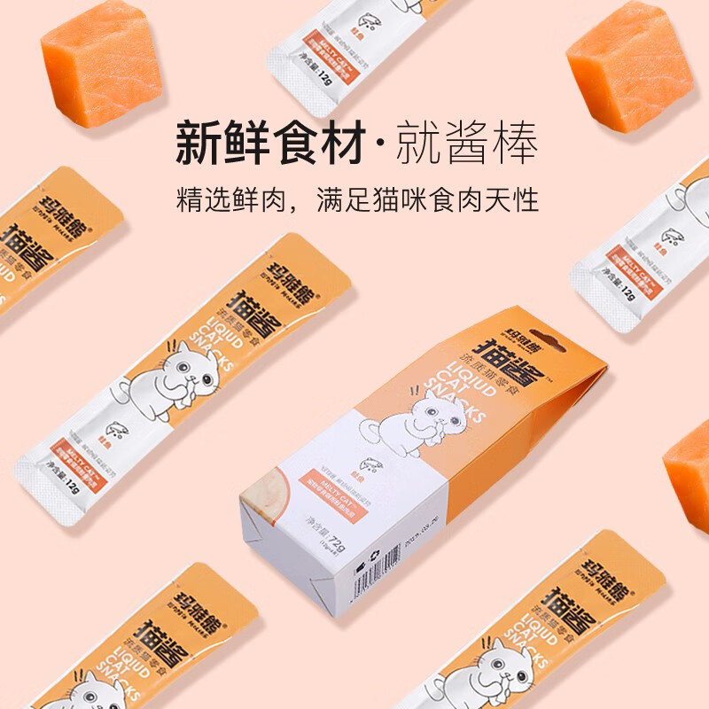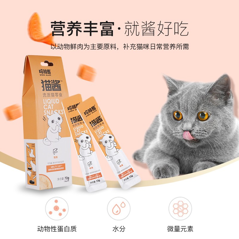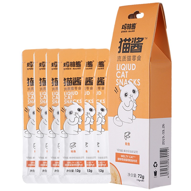 玛雅熊宠物猫零食猫条 鲑鱼(三文鱼)肉泥 成幼猫咪通用营养湿粮软包72g(12g*6支)整盒装