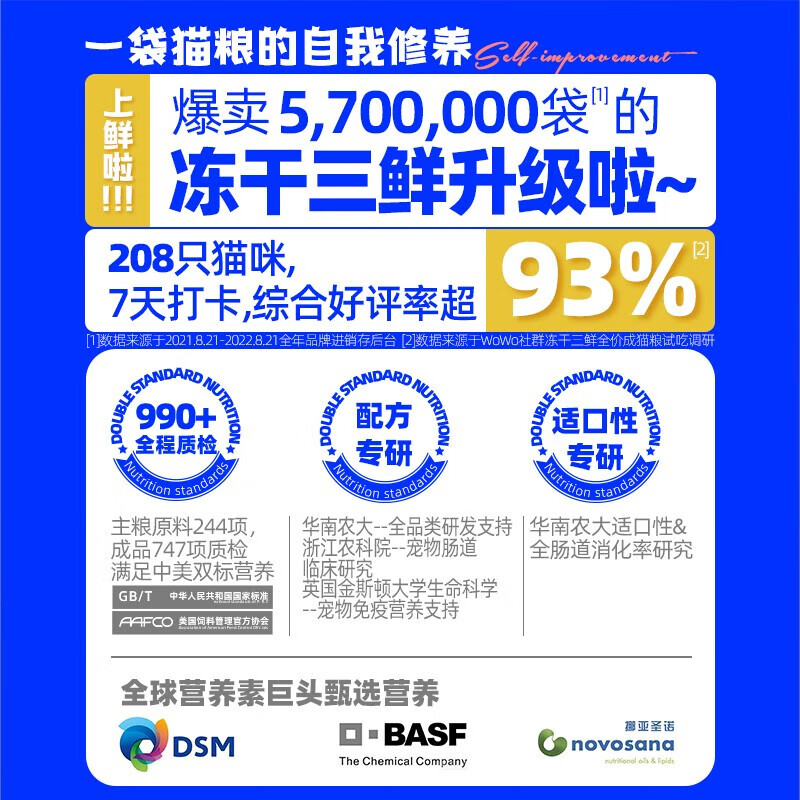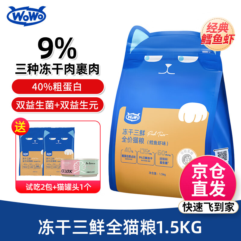 喔喔(WOWO)猫粮 经典鳕鱼虾味 冻干三鲜无谷猫粮宠物全价猫干粮 【经典鳕鱼虾】3斤
