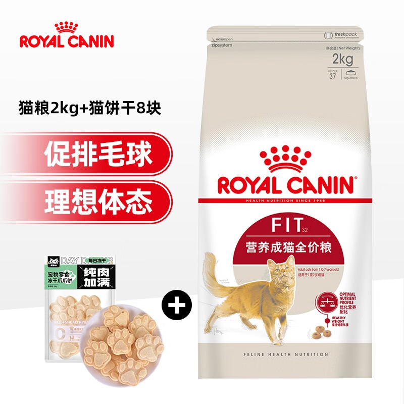 皇家(ROYAL CANIN)猫粮F32成猫粮室内猫全价营养猫粮通用系列英短蓝猫布偶猫粮 F32成猫粮2kg 冻干爪爪饼8块