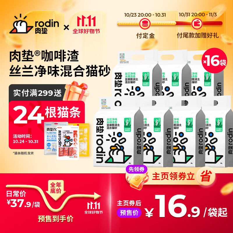 肉垫Rodin豆腐猫砂脚感舒适混合猫砂豆腐猫砂丝兰无尘结团 40Kg【预售】咖啡渣丝兰16袋