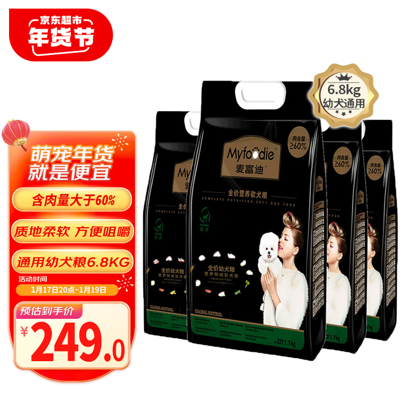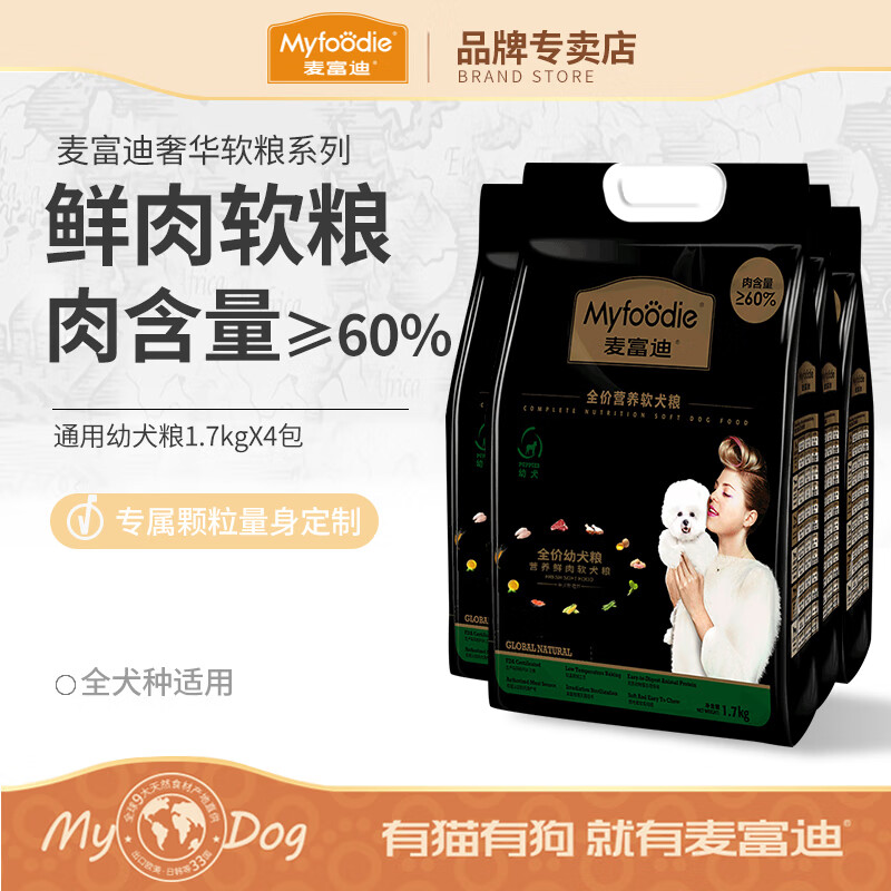麦富迪全价软狗粮 泰迪贵宾柯基通用型鲜肉营养天然粮 幼犬粮6.8kg整箱(1.7kgx4袋)