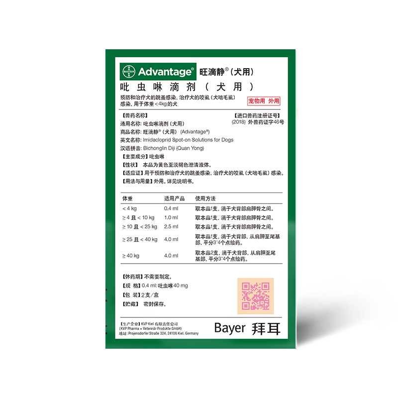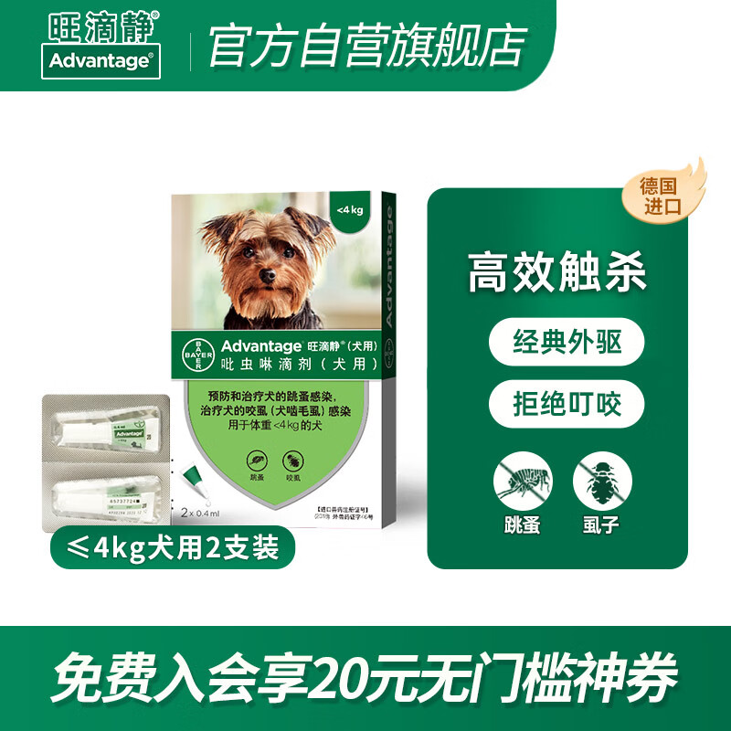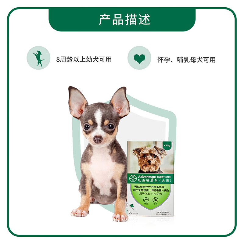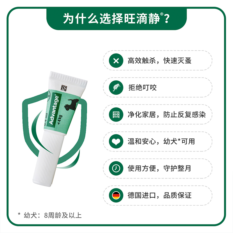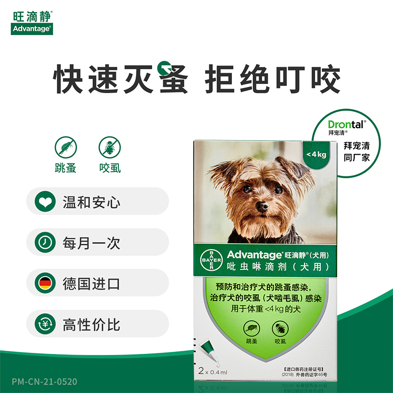 德国进口拜耳旺滴静(Advantage)小型犬体外驱虫滴剂 预防叮咬 防治跳蚤 狗体外驱虫 (<4kg犬用)整盒2支
