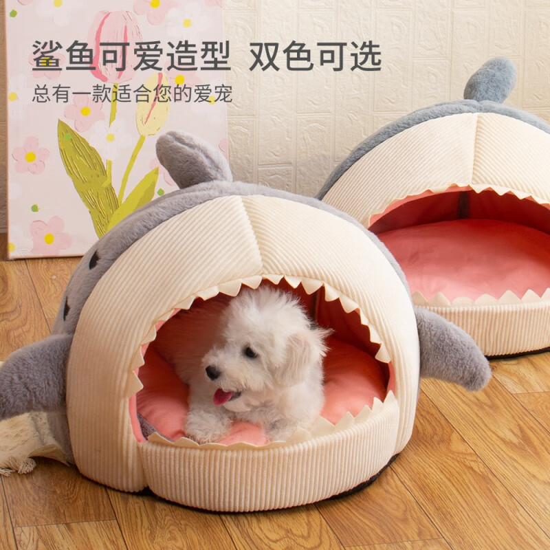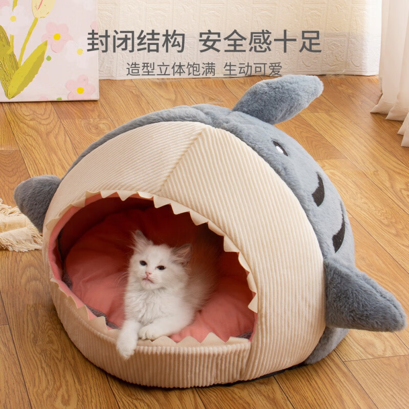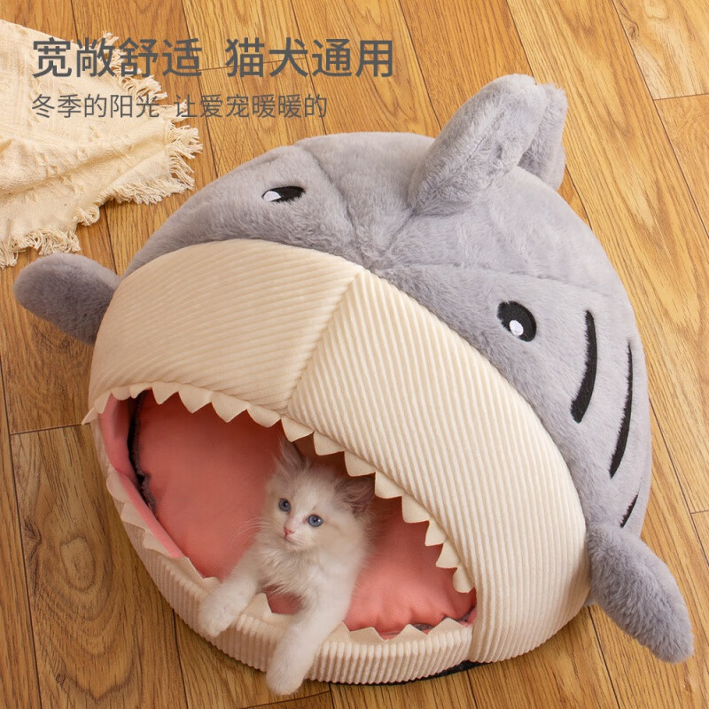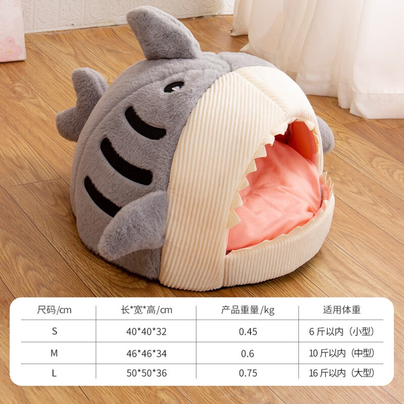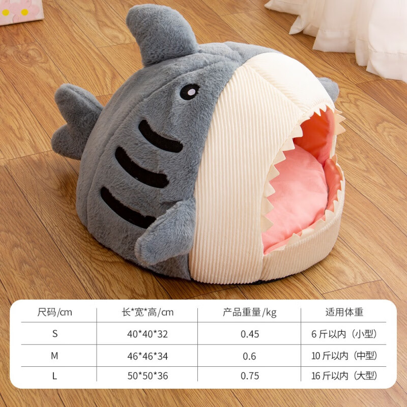 梦舒雅狗床狗窝猫咪床冬季网红保暖半封闭式鲨鱼猫窝垫宠物用品猫屋批发 鲨鱼灰蓝 L(50*50*36)16斤内