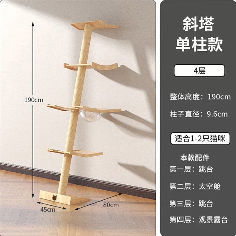 通天柱猫爬架斜塔猫架窗台顶天立地实木猫咪跳台猫立柱太空舱 单塔-4层[单柱款]